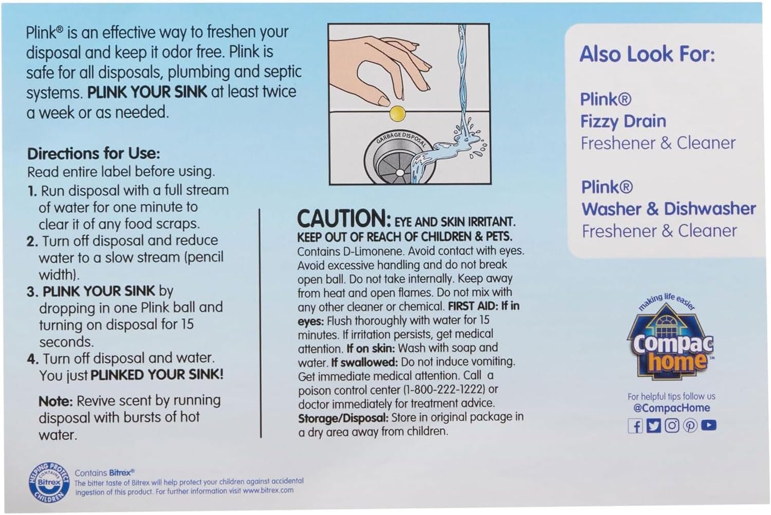 - One-time use per each Plink; for best results; use with Sink Daisy and Safe-T-Stuffer; household cleaning supplies - items also available from Compac Home