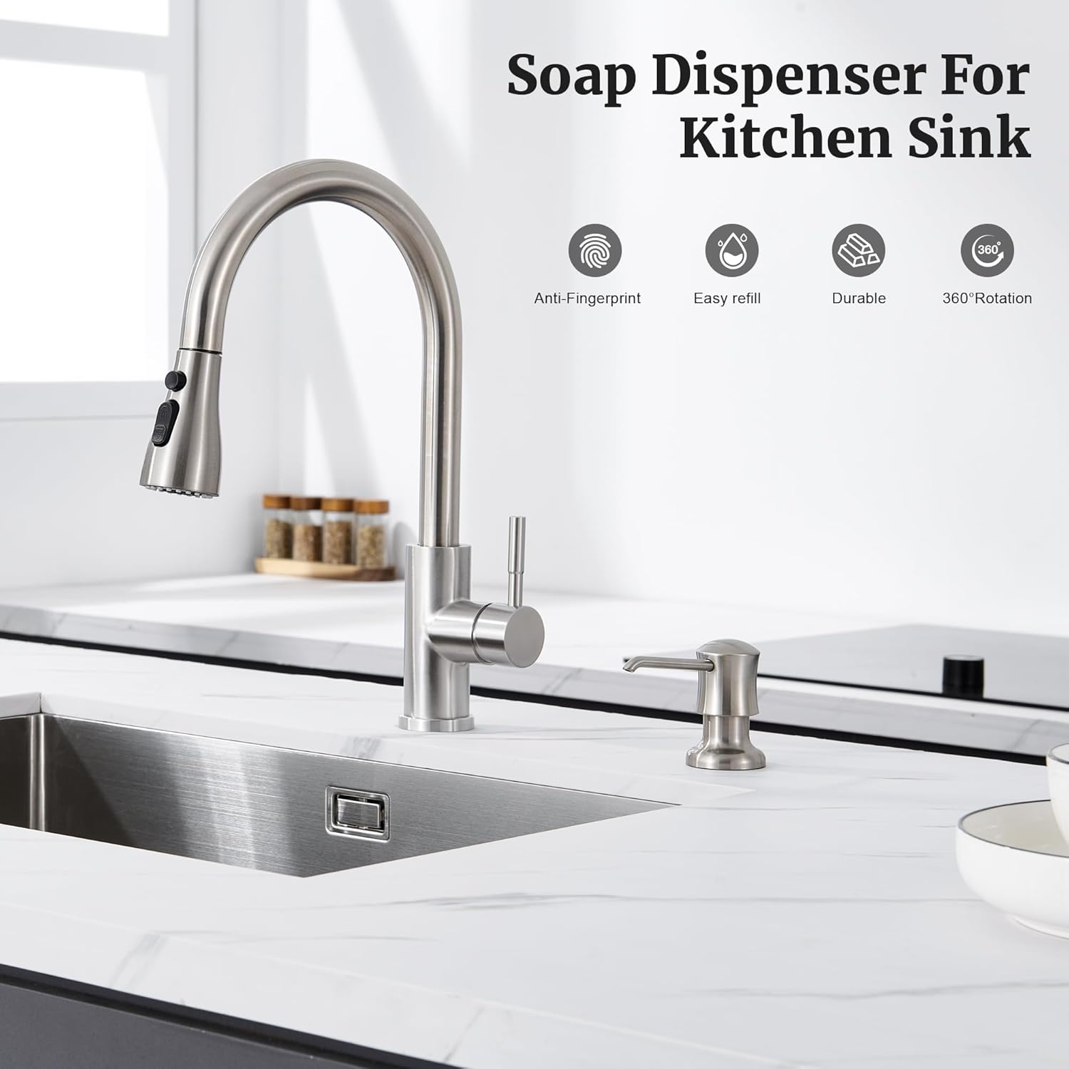 Soap Dispenser for Kitchen Sink Brushed Nickel, Built-in and Refill-from-Top Design with Liquid Hand & Dish Soap Bottle