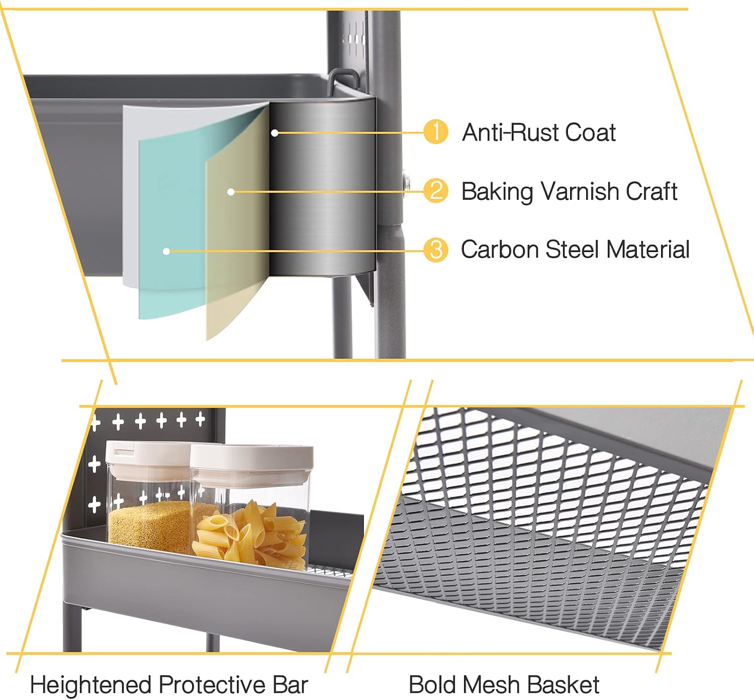 - đź’¦EXPLORE THE UTILITY for APPLICATION | Designed for creating extra storage space, this functional storage cart is friendly for space-saving and easy transport. Not only for pantry, kitchen, livingroom, bedroom, laundry room. But also perfect for office suppliers, classroom appliace, and hosipital suppliers. The side pegboards are effective to hang the things you want to organize.