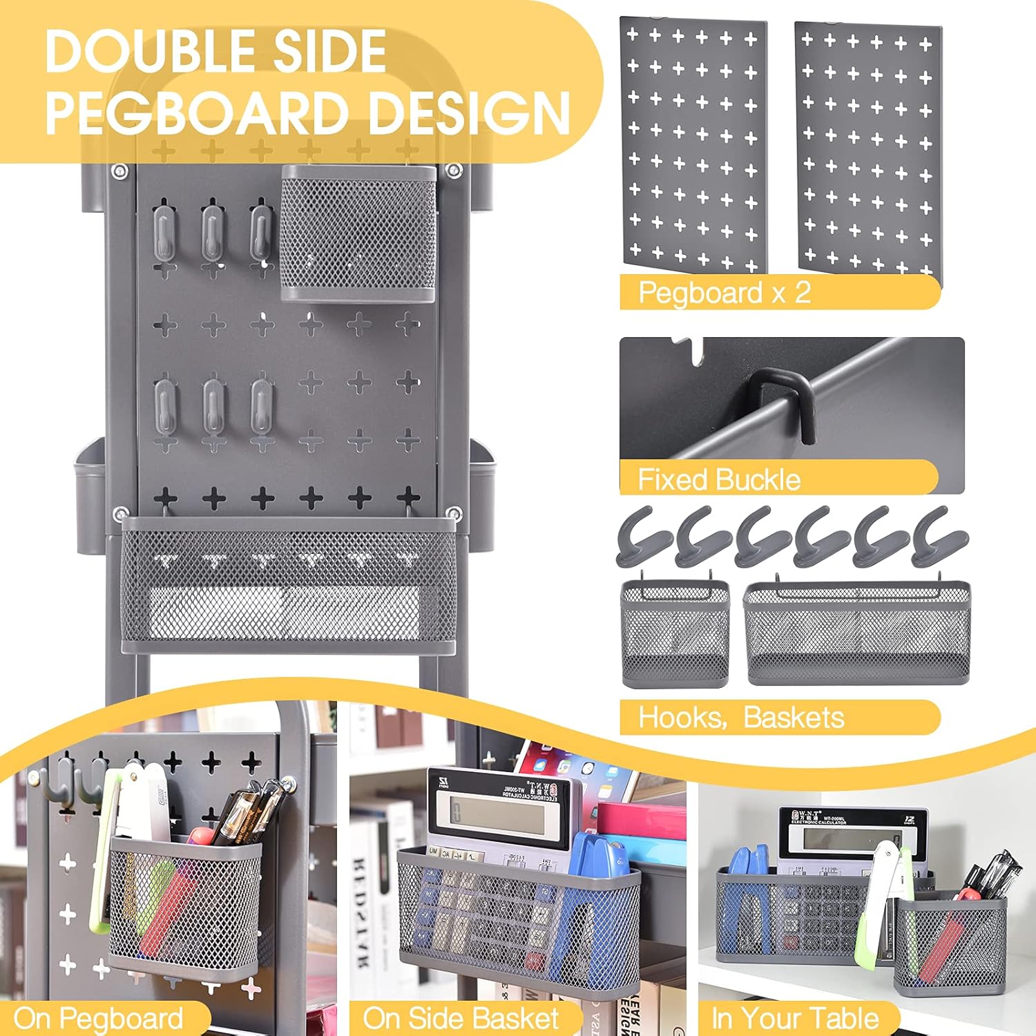 - đź’¦EXPLORE THE PEGBOARD for STORAGE | Compared with the ordinary trolley, our improved pegboard cart consists of perforated steel pegboard on BOTH SIDES which can DIY according to your preferences and needs! In addition 2 bins, 6 hooks are included, creating more possibilities on abundant space for variety storage.