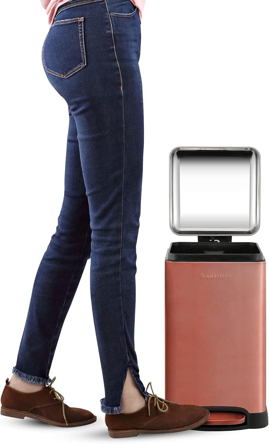 - STYLISH & PRACTICAL DESIGN: happimess Trash Cans clean-lined designs blend beautifully into your existing decor; Dispose of trash hands-free with our convenient step pedal; built-in damper lowers the lid quietly, and closes it tightly to keep odors inside