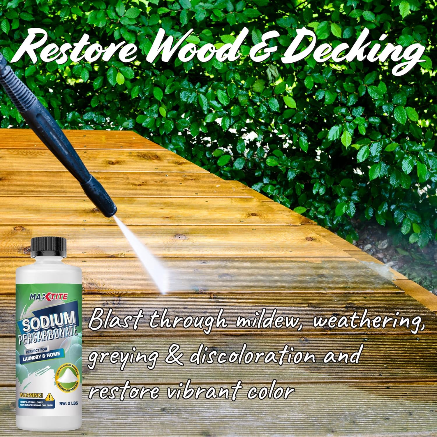 - MULTI-PURPOSE applications include detergent-boosting whitening and cleaning for laundry, carpet, whitening grout, bleaching and lightening wood or deck cleaning.