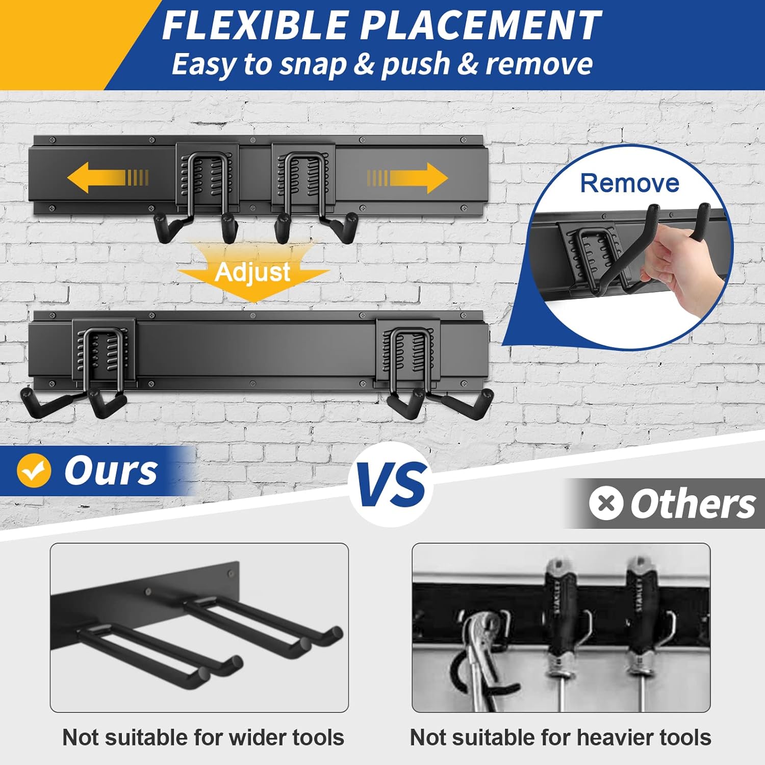 - 32-inch Adjustable Garage Wall Tool Rack: The whole length of the garage organizer wall mount is 32 Inches. Equipped with 4 hooks(2 tool hooks, 2 double-layer hooks) and 2 rails, this adjustable garden tool holder wall mount organizes all your garage/lawn/garden/tool storage room to save floor space.