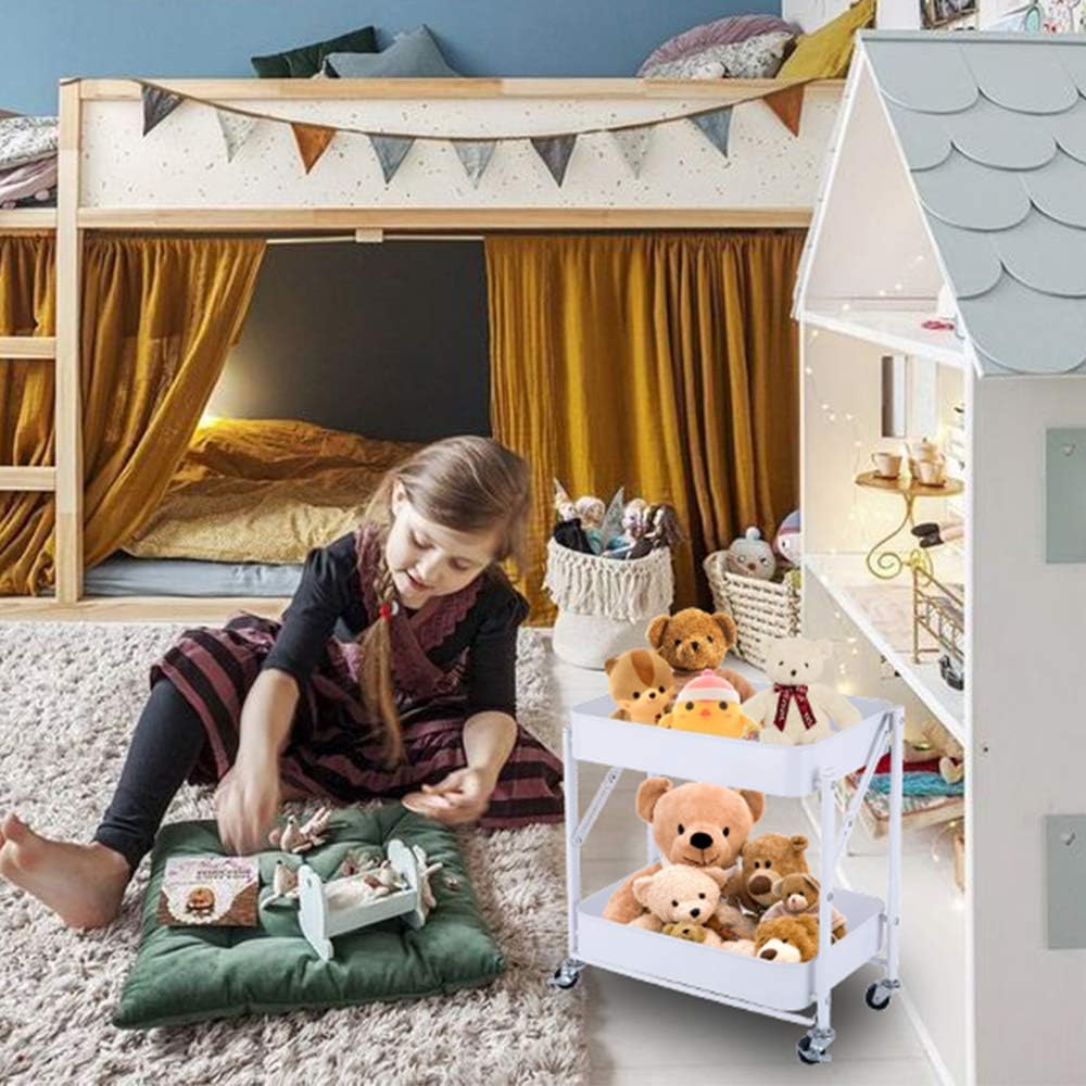 - 【Multifunctional Storage】-- This foldable 2 tier rolling storage cart has multiple functions which can be used anywhere you want it to be such as office, bathroom, kitchen, art studio, salon, garden, garages, laundry rooms hobby and craft areas and so on. It can be used as a tools cart, organization rack, sofa or bed side end table, nightstand, book cart, bedroom/living room storage cart and so on.