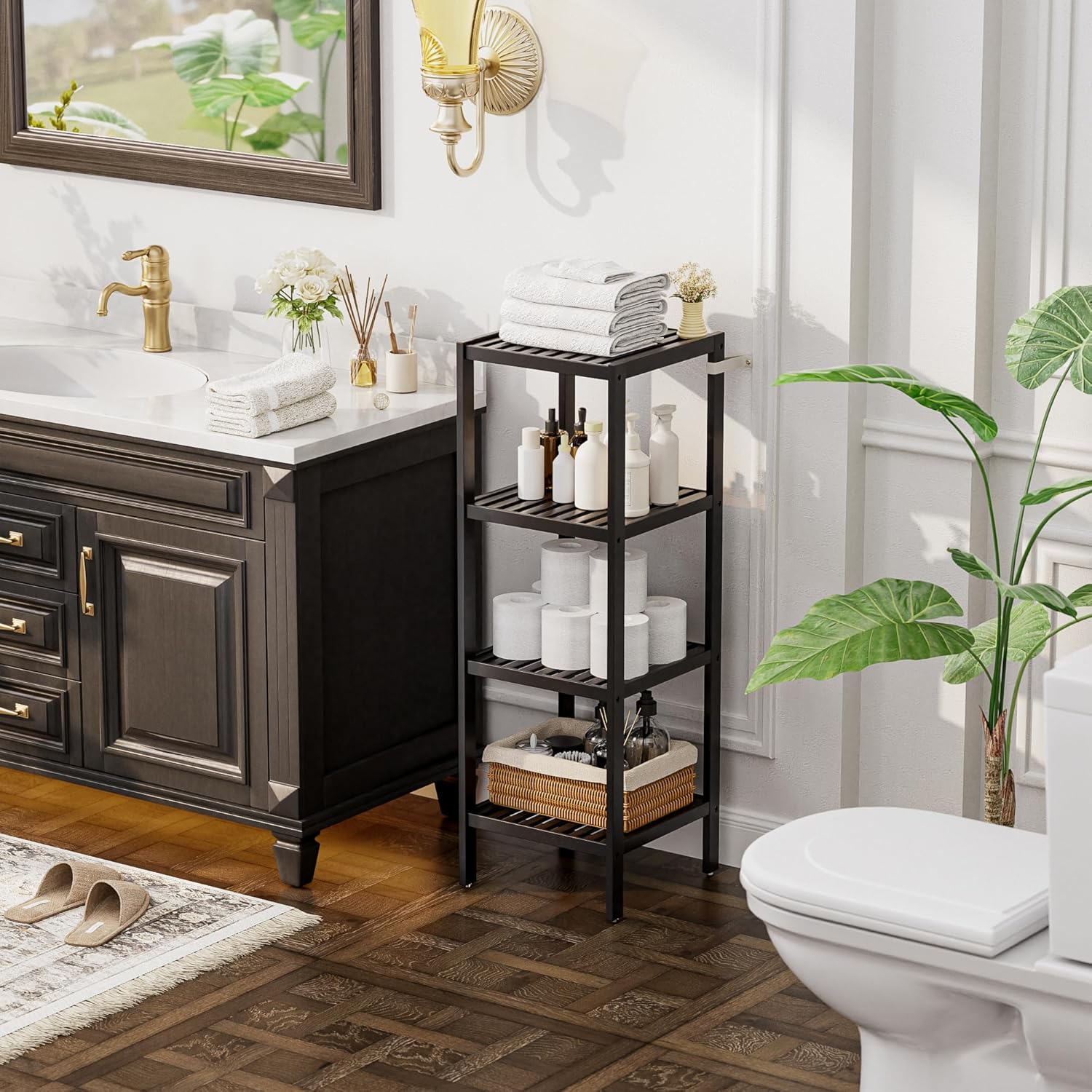 SMIBUY Bathroom Storage Shelf, 4-Tier Bamboo Rack Organizer, Multifunctional Shelving Unit for Living Room Bedroom Kitchen (Black)