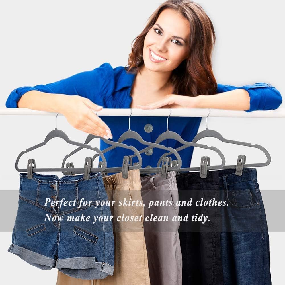 - ✅ PREFECT FOR YOUR CLOSET - The grey velvet hangers clips are fixed to the velvet hangers to provide you with more closet space and keep your clothes tidy