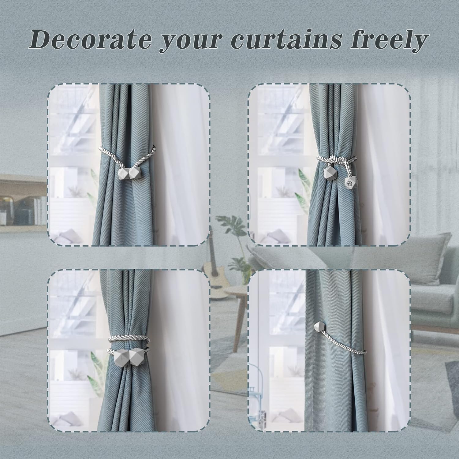 - [Variety of use methods, suitable for a wide range of scenarios] You can clamp the curtains in different elegant ways, and when you don't use the curtains, you can fix them anywhere, which is perfect for living room, bedroom, kitchen, dining room, bathroom and office.