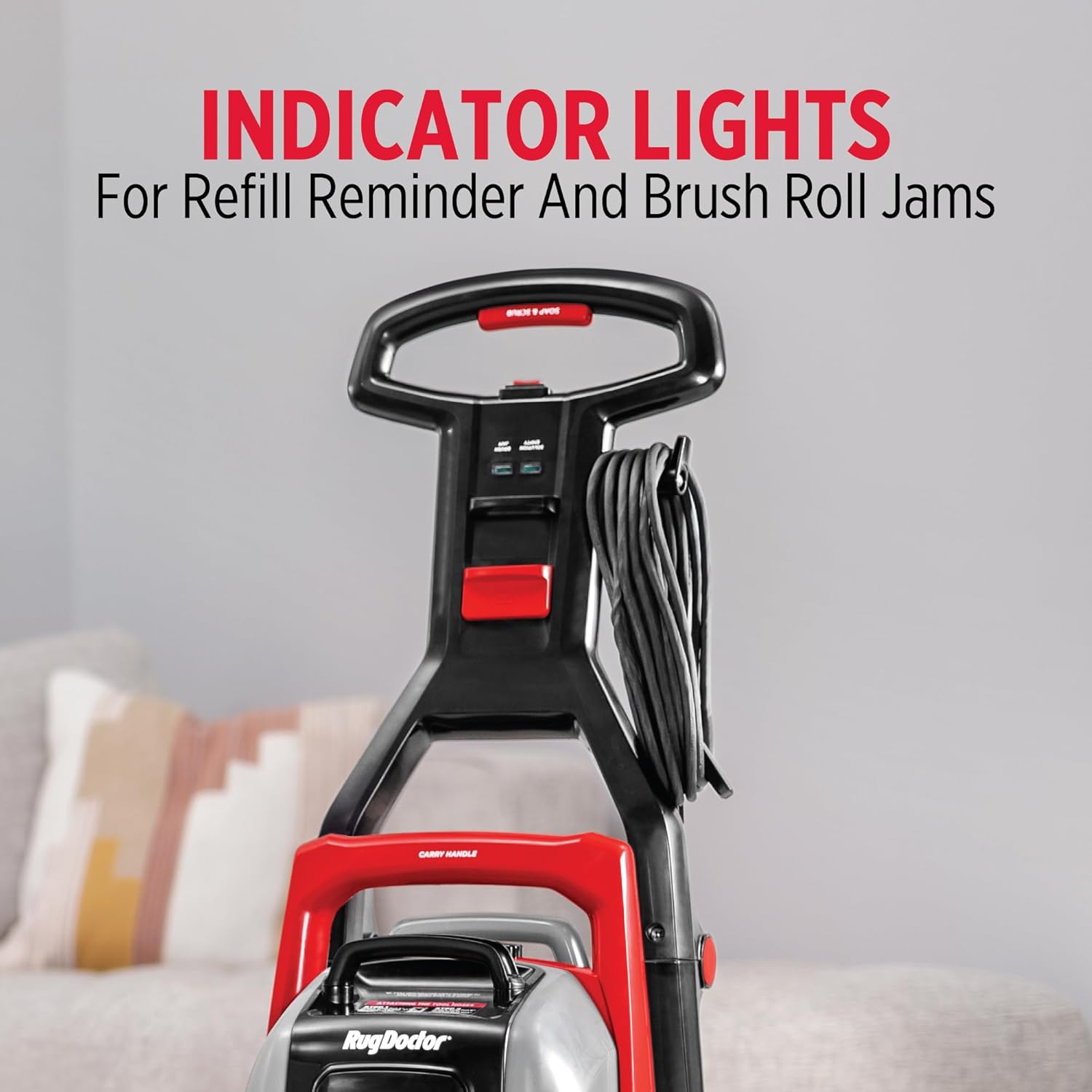 - DIGITAL INDICATOR LIGHTS alert user when it's time to refill the cleaning solution tank and when the brush roll is not operating correctly.