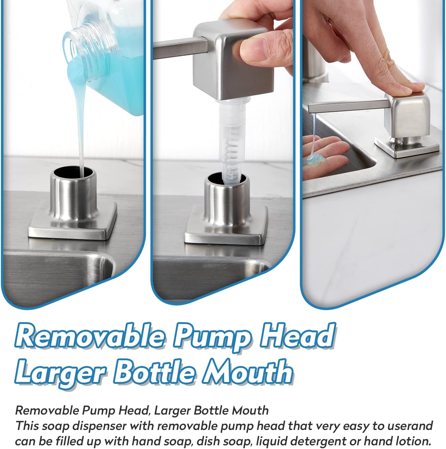 - 💧【MULTIPURPOSE 】 Our dish soap dispenser can be used in a variety of ways, it do not need much space which makes them practical for kitchen or bathroom, laundry RV sink . Fill it up with hand soap, dish soap, liquid detergent or even hand lotion. This sink soap dispenser will let everything look more free and organized.