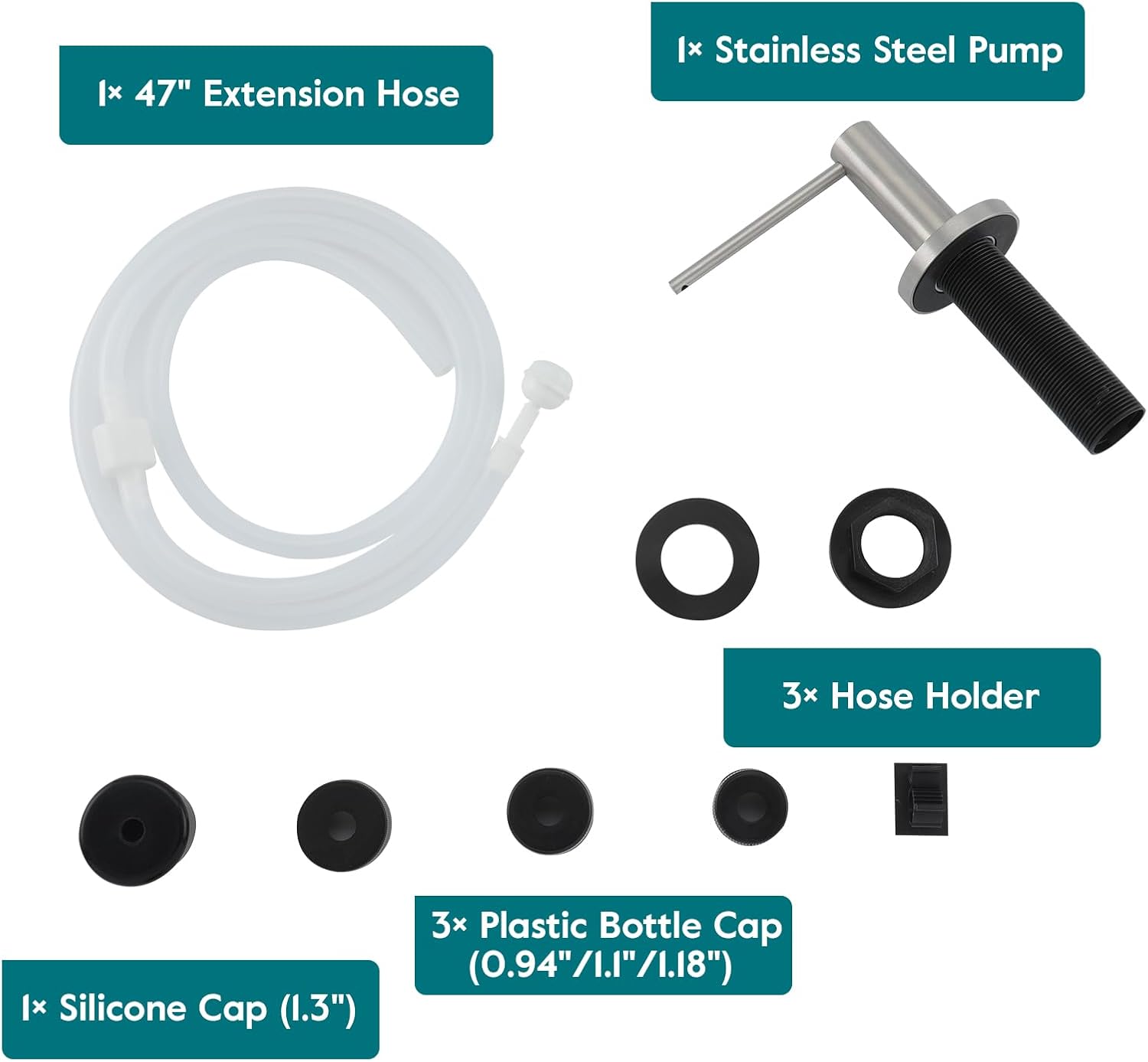 - No More Messy Refills: Our sink soap dispenser pump is equipped with a 47" extension tube, you can insert the tube directly into the large dish soap dispenser. No need to refill small canisters anymore