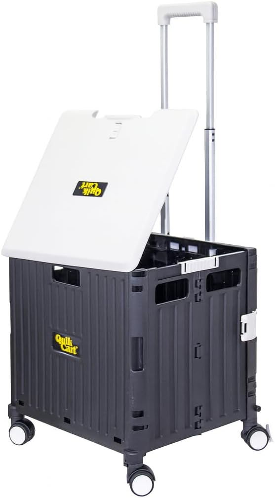 dbest products Quik Cart Swing Lid Four Swivel Wheeled Rolling Crate Teacher Utility with seat Heavy Duty Collapsible Basket with Dual Telescopic Wagon Handle