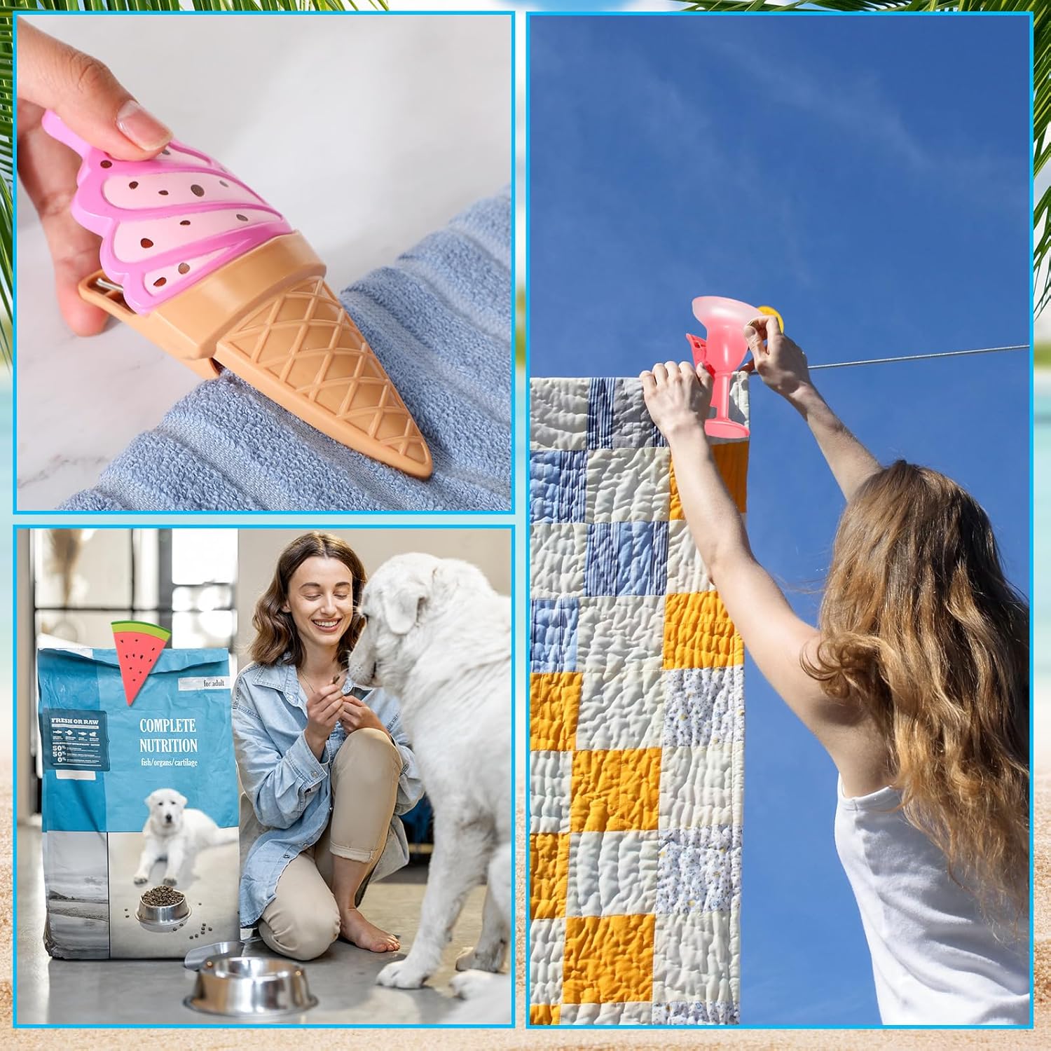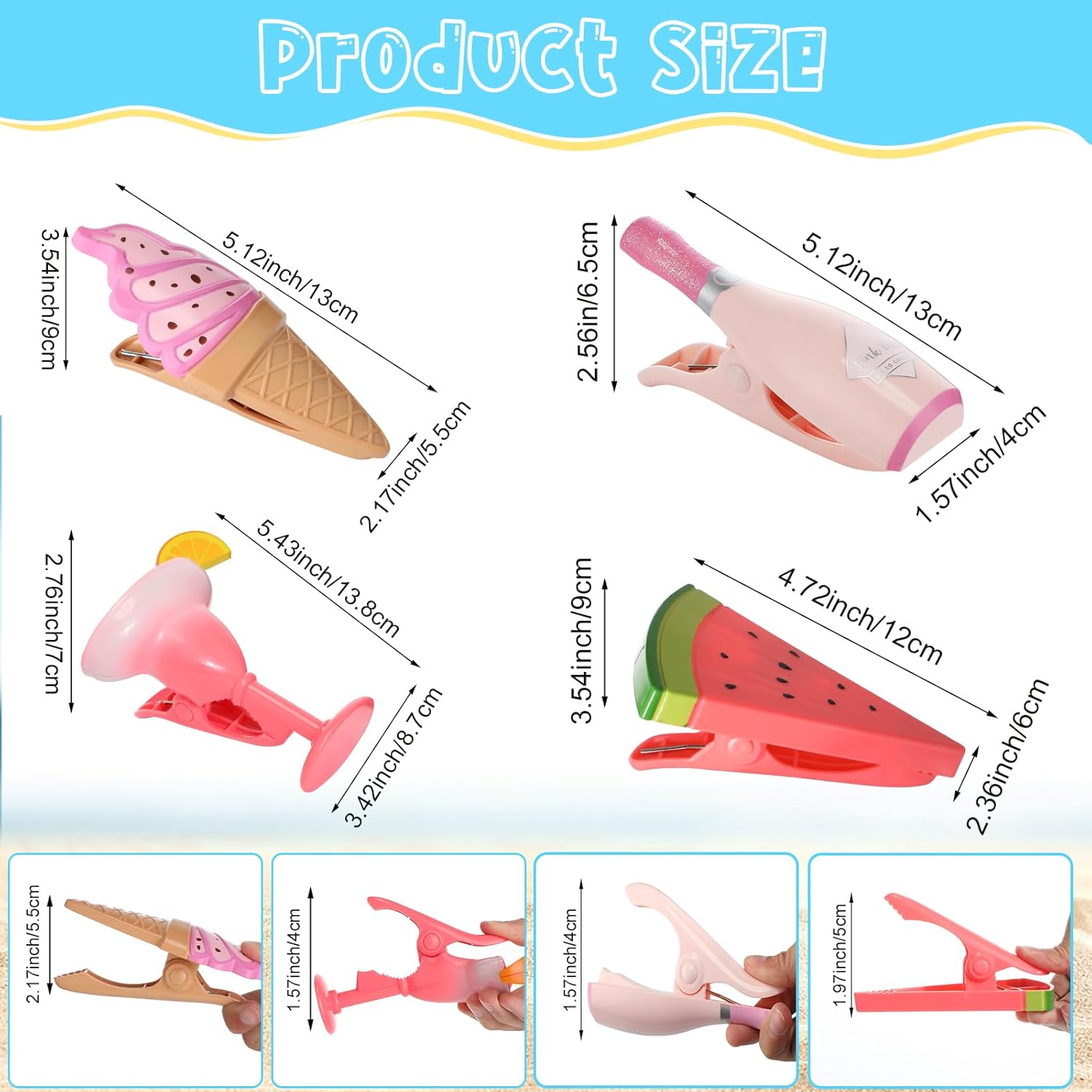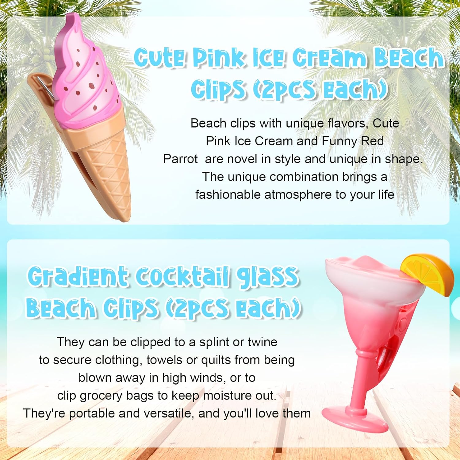 - Cute and Funny: the decorative beach towel clips adopt champagne glass, gradient margarita glass, ice cream, and watermelon styles, look cute and funny, you can use them to clip clothing, towels, and bedding