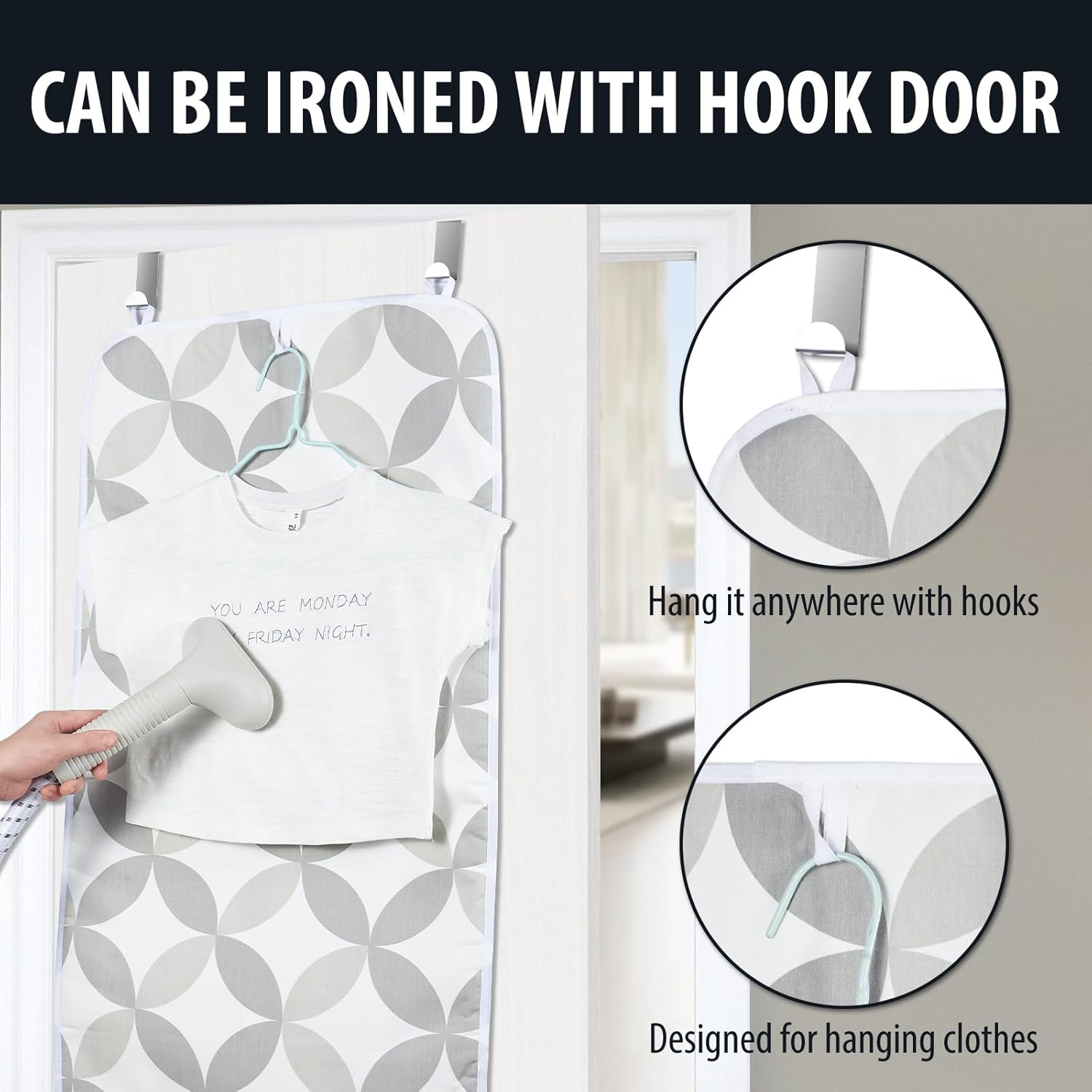 - HANGING IRONING DESIGN: There has three hanging holes on this mat, two for hanging on the door or other places. The middle one is for hanging clothes. Can be used as a over the door ironing board. You are not limited on the table top for ironing. This item is good partner for steam iron. Two hooks are included