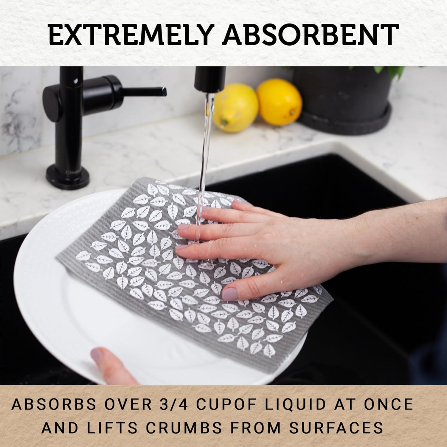 - Shockingly Absorbent cloths pick up water like a sponge. Each cleaning cloth absorbs more than half a cup of liquid before needing to be wrung out. They also pick up dry particles (like crumbs, flour, dust etc.) instead of spreading them around like other kitchen rags. Unlike sponges however their large flat composition makes them dry fast, avoid bad smells, and clean more- faster. Now you can up your game by using these Swedish dish towels for kitchen use or anywhere around the house (or car!)