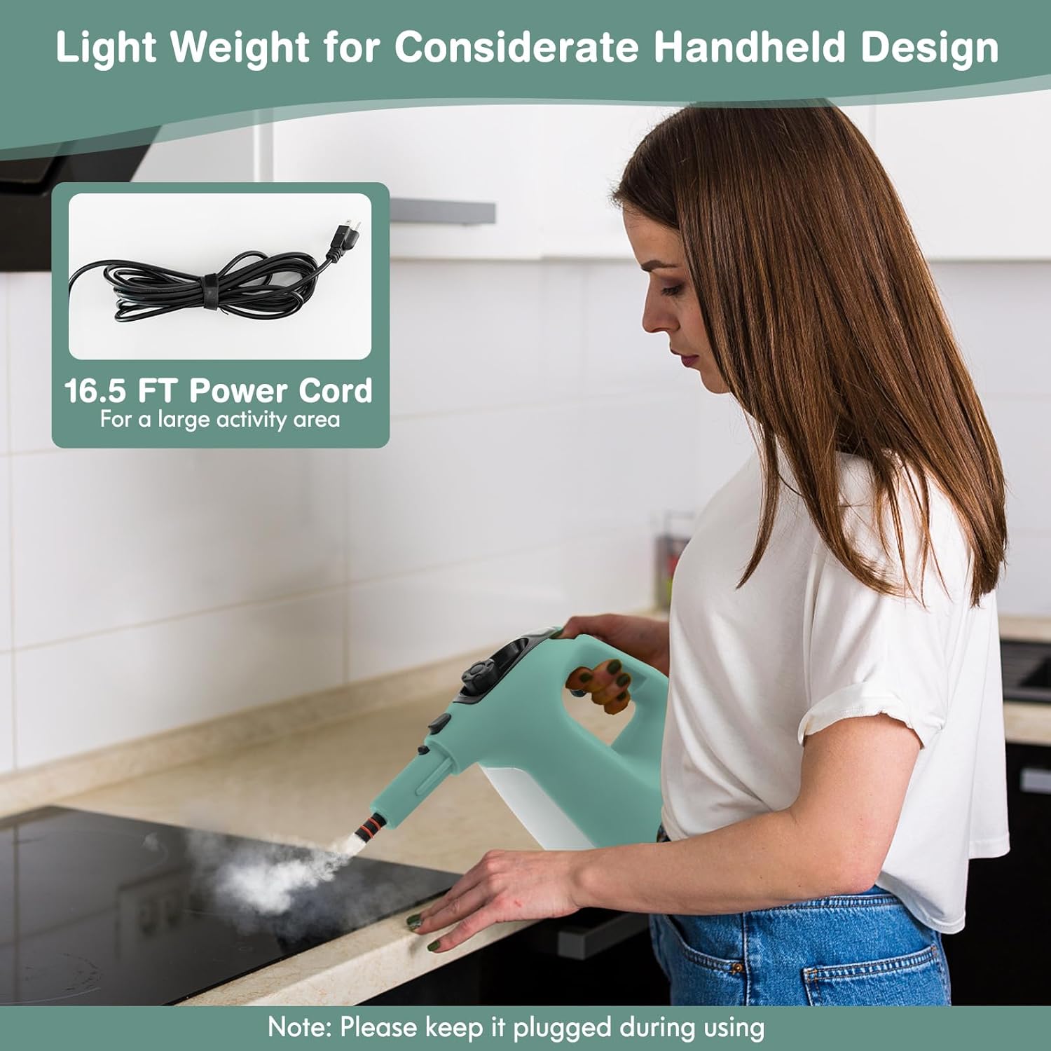 - [Maneuverable Mop Cleaner]Connected with the extension tube and floor brush, the portable handheld steamer can be converted into a practical floor steam mop for all-around cleaning.The 106" power cord allows you to go further to sanitize any hard-to-reach areas.Moreover, its compact body with handle creates an effortless grip that you can easily clean from room to room.