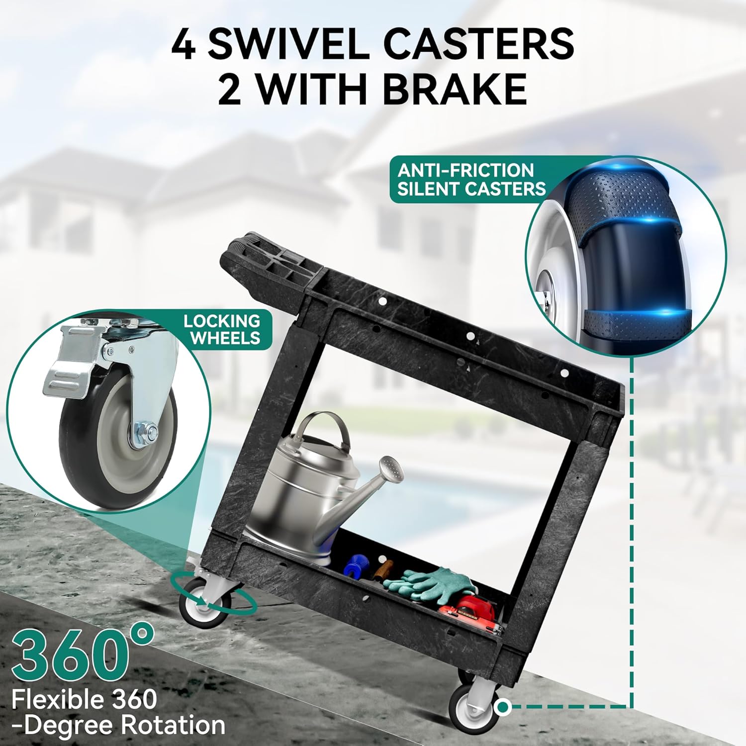 - LOCKING WHEELS: This utility service cart 2 shelf with four 5-inch swivel casters made of industrial-strength polypropylene for smoothness and durability, and two of them are lockable for 360-degree flexibility and labor-saving transportation. Meanwhile, the exterior thermoplastic rubber wrap not only absorbs vibration and reduces noise, but also prevents floor scratches and carpet snags.