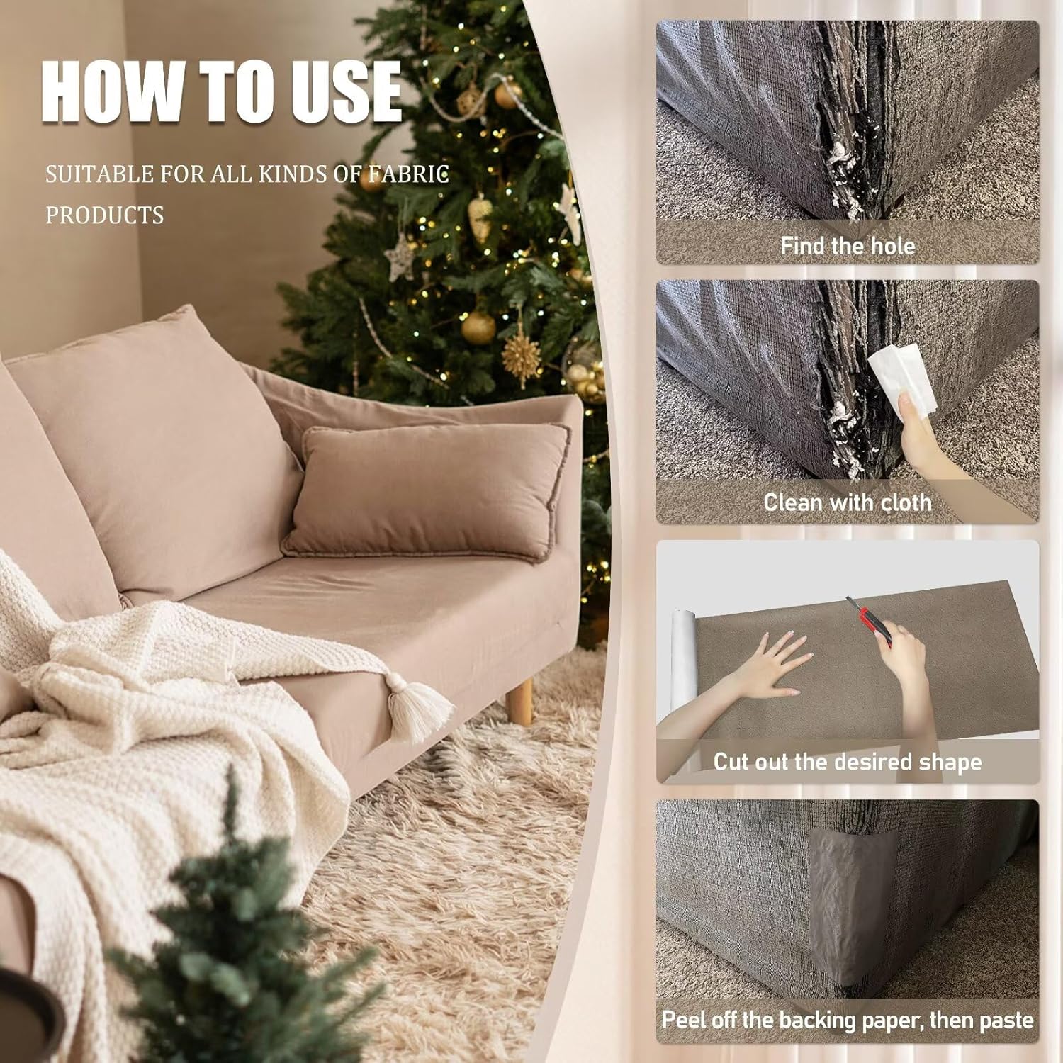- Instructions:Step 1: Clean the surface of the item to be repaired.Step 2: Cut the fabric repair patch into the desired shape.Step 3: Slowly peel off the backing paper from the back while adhering the patch to the surface.