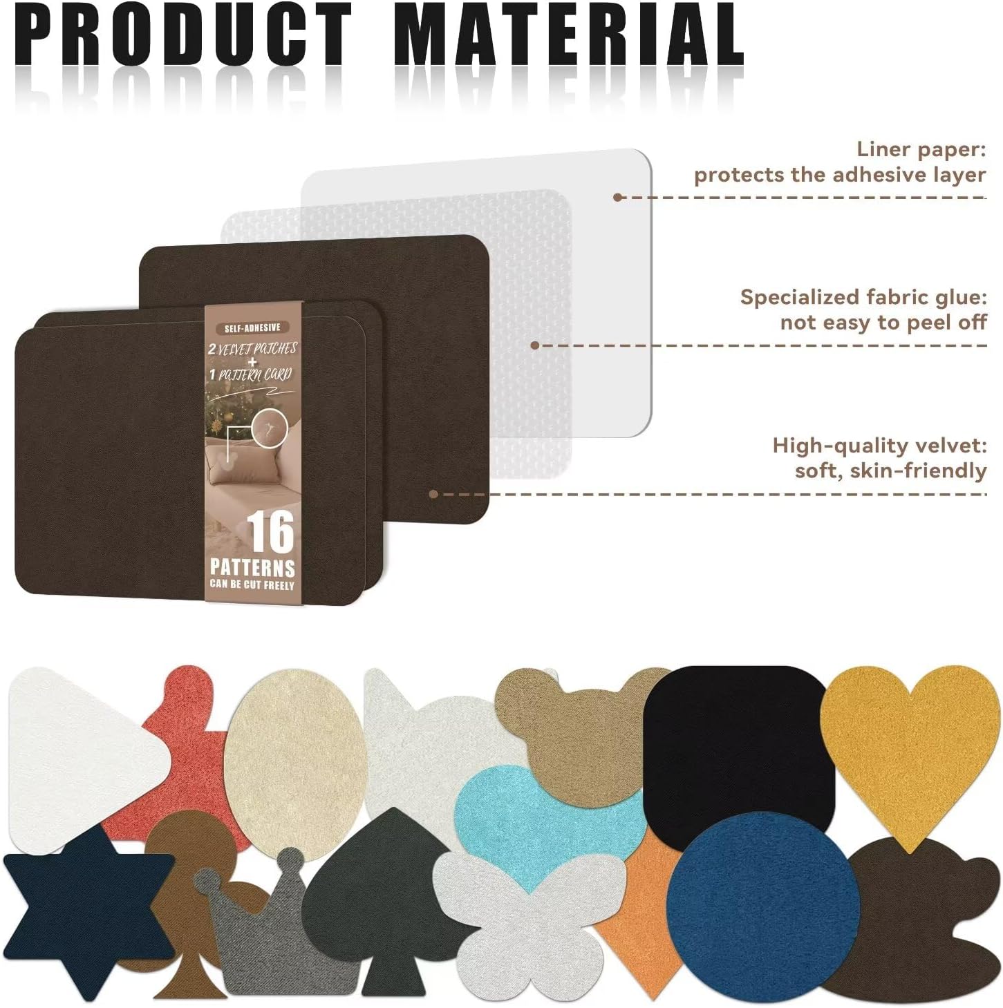 - 【Packaging Includes】:This fabric repair kit includes 2 pieces of 8.3 inch x 11 inch Velvet Patches, along with a pattern card (16 patterns available for cutting).