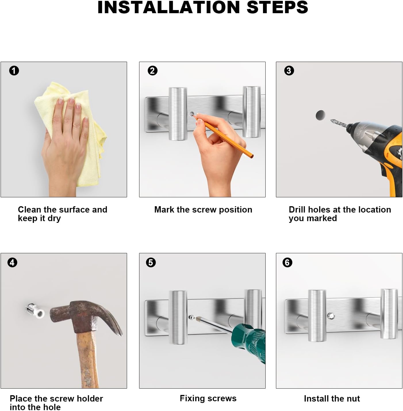 - VERSATILE USE:This Silvery Row Hook Coat Rack with 5 Hooks is good for various locations, including bathrooms, kitchens, living rooms, entrances, and offices. Use it to hang towels, kitchenware, coats, hats, jackets, wallets, keys, and more, adding functionality and organization to your space