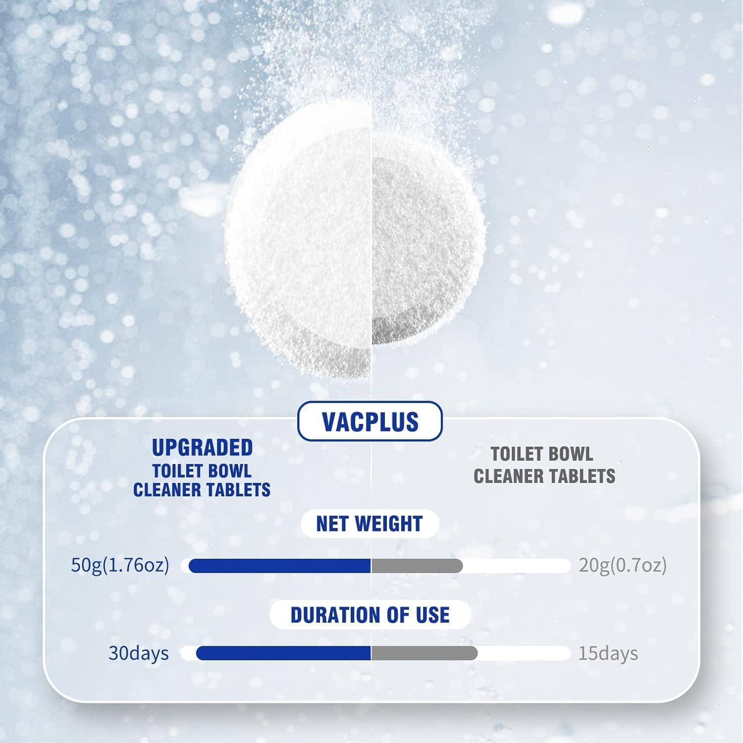 - LASTINGLY CLEAN: With an upgraded capacity of 50g each, a Vacplus toilet cleaner with bleach continuously cleans the toilet for up to 30 days. With 24 packs for replacement use, Vacplus toilet tablets can keep the toilet bowl fresh for more than 24 months.