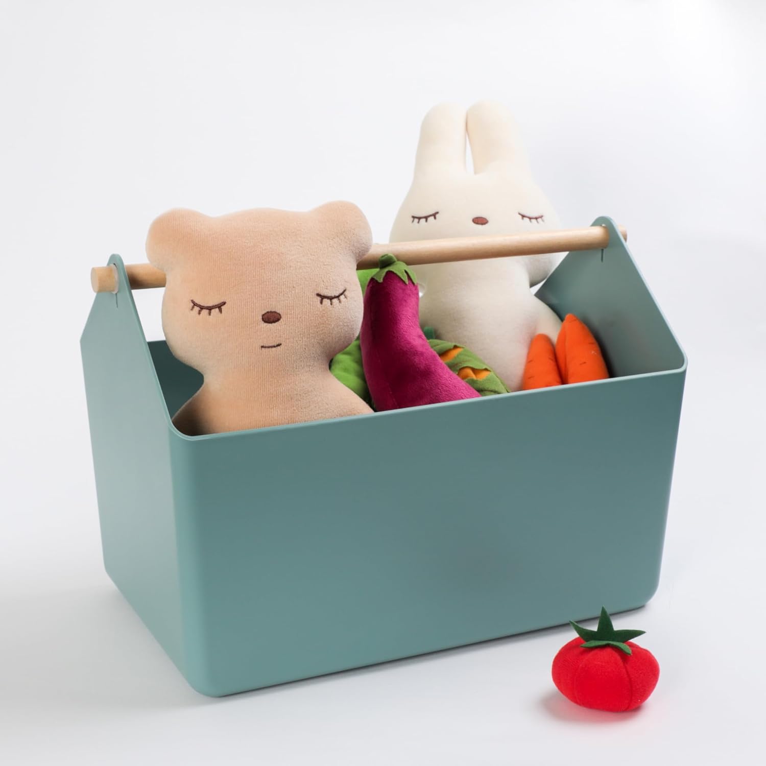 BLUE GINKGO Large Storage Basket – Plastic Caddy with Wooden Handle for Bathroom, Pantry, or Cleaning Supplies (Green)
