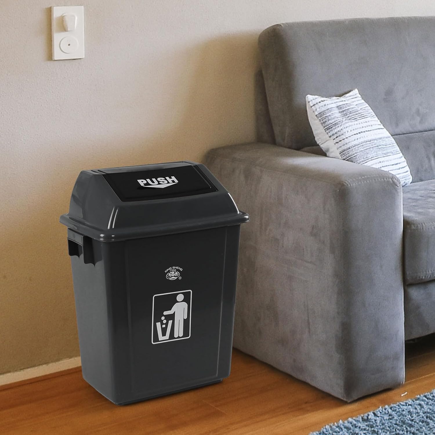 - Our trash can is equipped with swing lid that can be gently turn off after throwing garbage away, reducing the spread of garbage odors and germs
