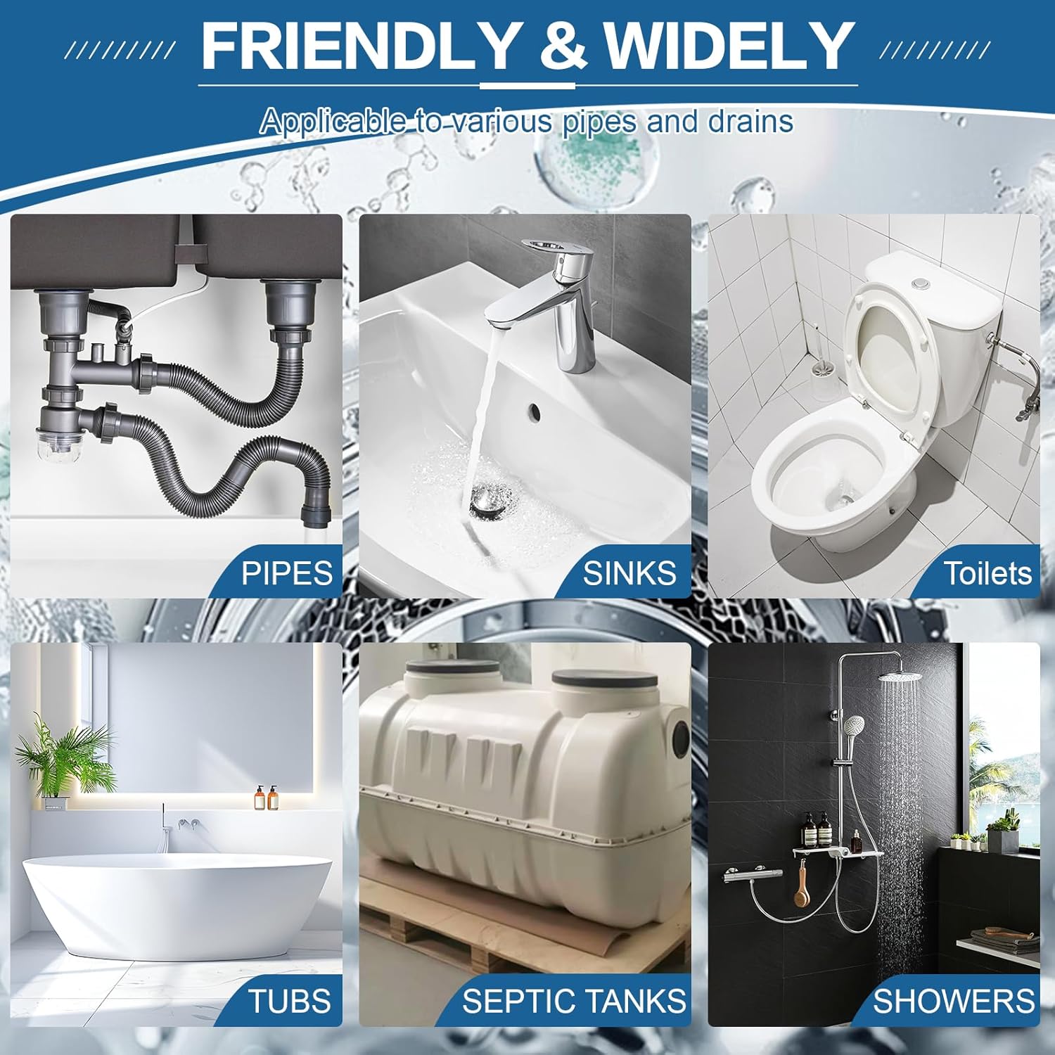 - Versatile and Powerful: Suitable for kitchen sink, bathroom, and toilet drains, bathtub, showers, floor drains, urinals, RV drains, and more, this drain cleaner is effective on a variety of common blockages. Whether it's stubborn grease in the kitchen or hair buildup in the shower, it tackles it all