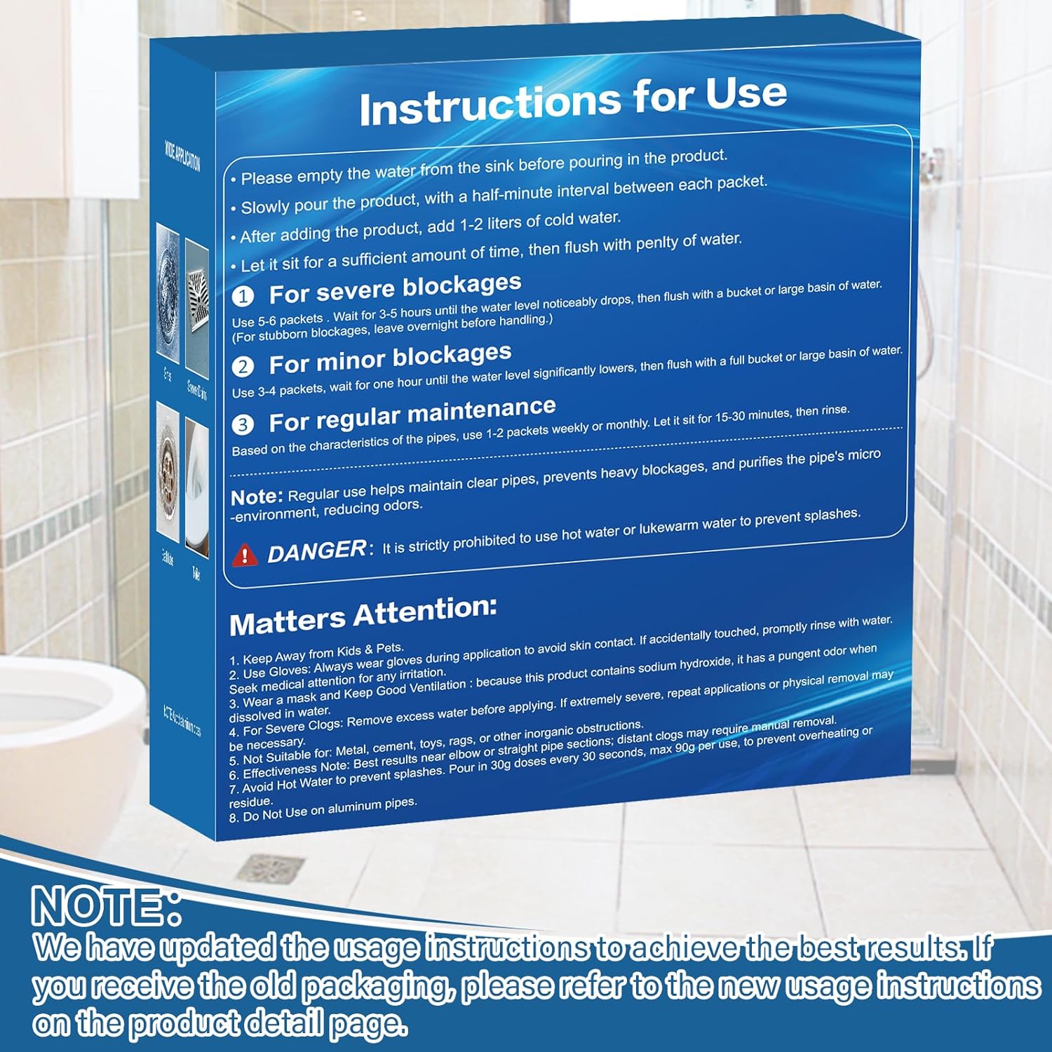 - Easy to Use: Individually wrapped. Simply pour the drain clog remover into the clogged drain, allow it to sit for the recommended time, and then flush with cold water. No complicated tools or procedures needed—just pour, wait, and rinse