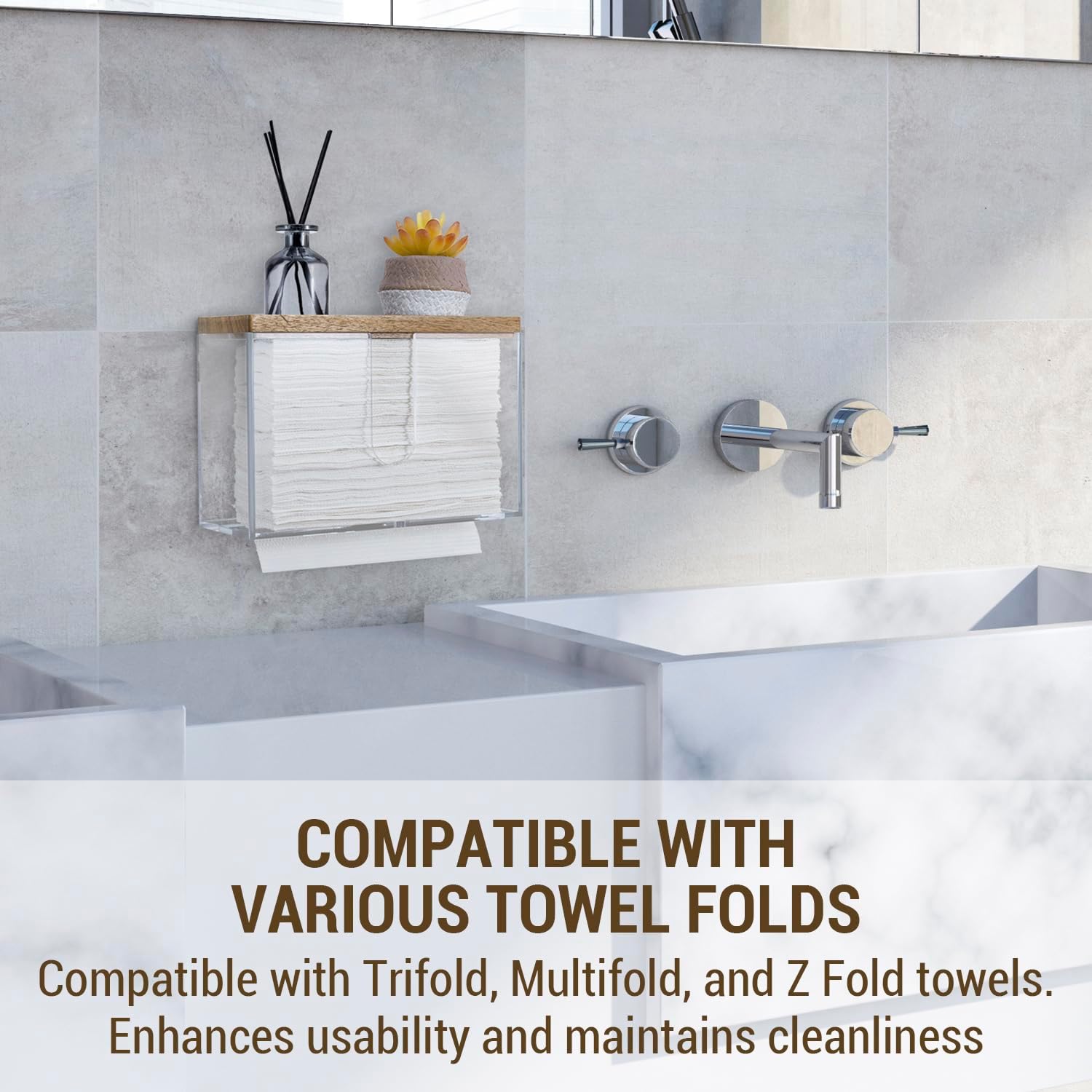 - Wall mounted folded paper towel holder and wooden display tray for commercial guest use in a bathroom, kitchen, office break room, and more