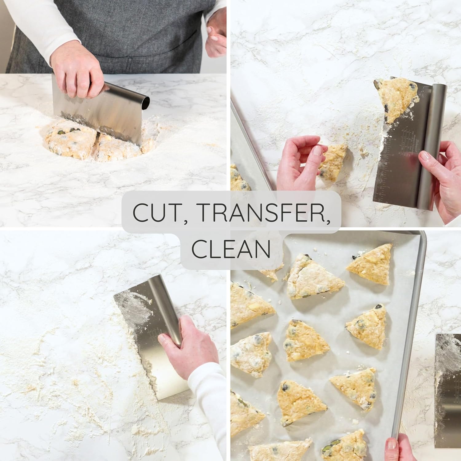 - Ergonomic Design Dough Cutter and Scraper - Featuring a comfortable, wide handle for a secure grip, this tool ensures easy handling and allows you to glide through dough with precision and ease during baking prep. Set includes small, medium and large bench scrapers.
