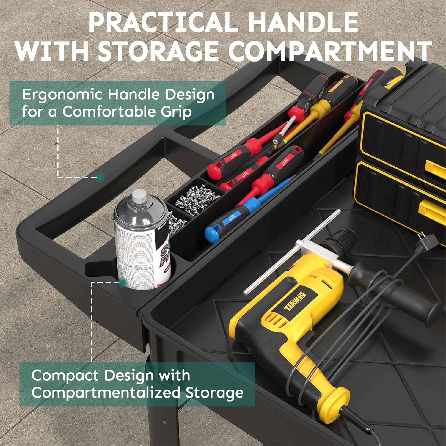 - 【Portable Design】Plastic utility service carts are equipped with ergonomic armrests that allow you to move with less effort and experience a comfortable grip. Modular storage compartments and small holes are designed to keep your tools handy and enhance your experience.