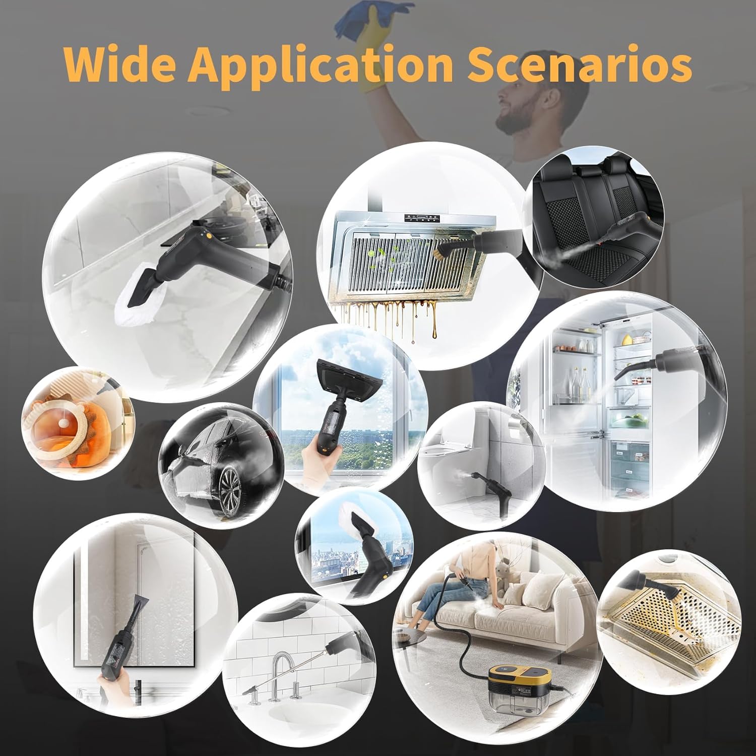 - 【3-level Adjustable Knob】The handheld steam cleaner features a 6-level adjustable knob, allowing you to fine-tune the steam intensity to suit a variety of daily cleaning tasks. Additionally, it delivers approximately 3 bar of high-pressure steam, with the capability to heat up and release high-temperature steam in just 10 seconds, effectively loosening and dissolving dirt for efficient cleaning