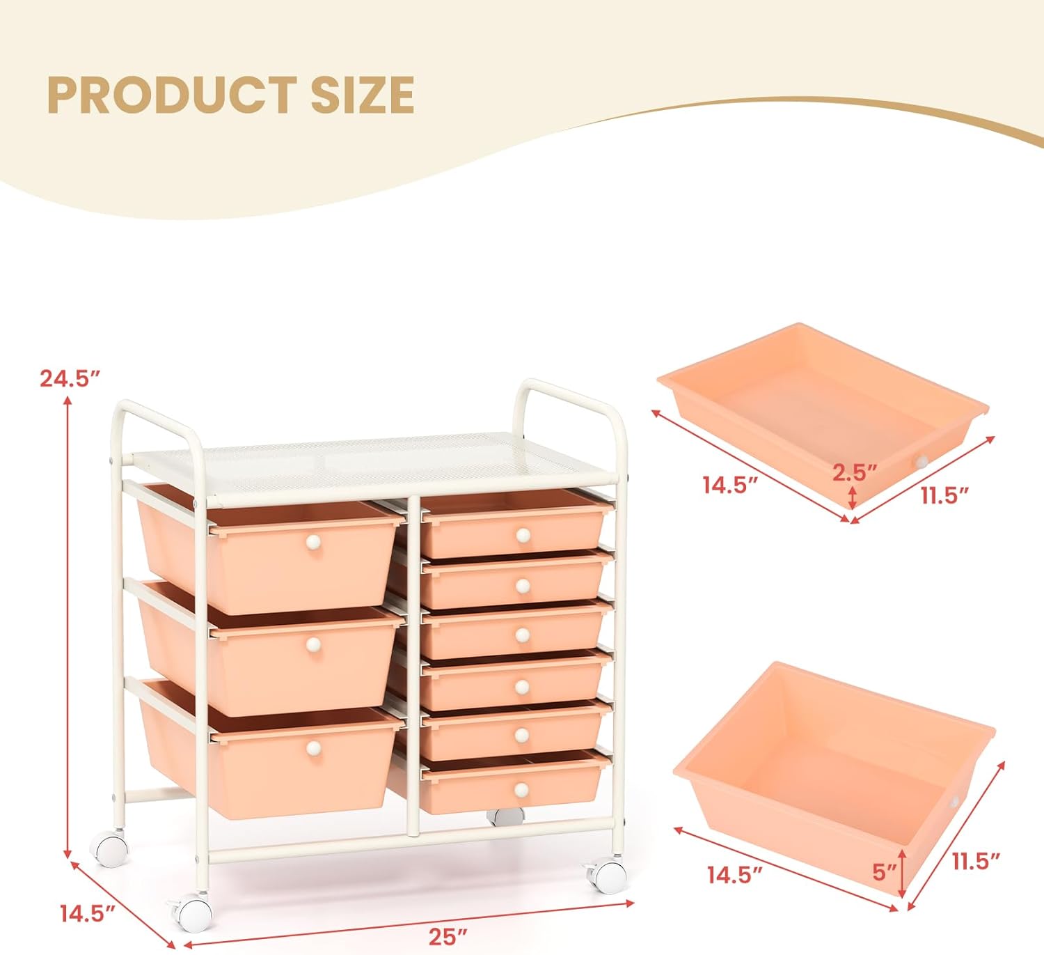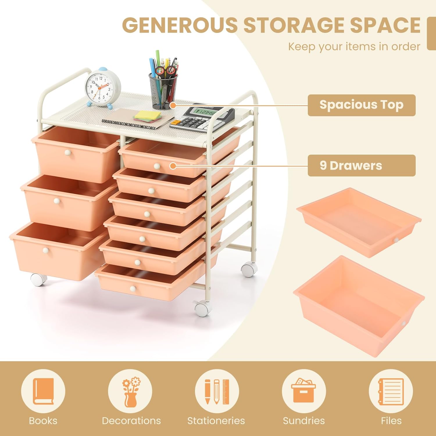 GOFLAME 9-Drawer Rolling Storage Cart, Mobile Utility Cart with Removable Drawers & Metal Frame, Art Craft Organizer Cart with Lockable Wheels, Storage Drawer Cart for Home Office School, Peach Fuzz