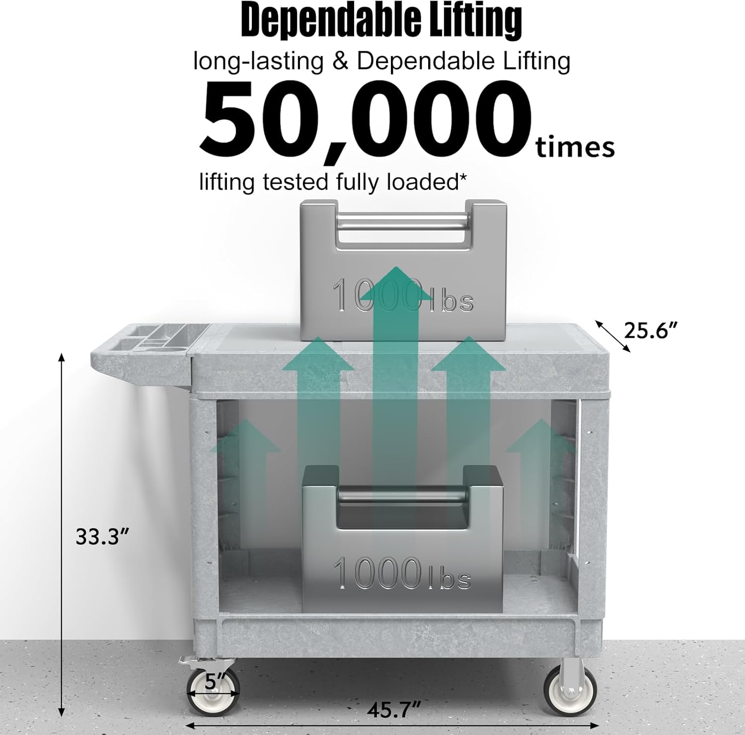 Utility Cart on Wheels, Heavy Duty Large Flat Top Rolling Service Cart, 46 x 25 Inch Work Carts, 2 Shelf 1000 lbs Capacity Plastic Tool Cart, for Warehouse, Garage, Cleaning, Gray