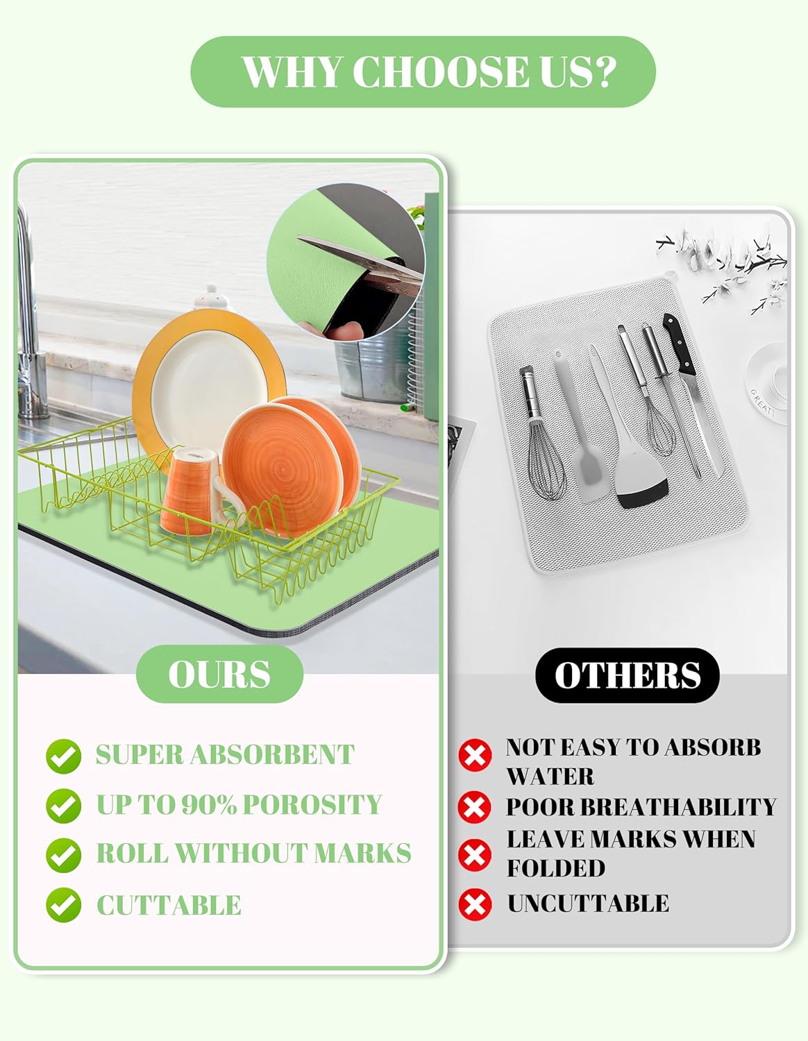 - Super Absorbent: Dish Drying Pad is made of super absorbent nano, the drying pad is soft and highly absorbent, which can dry quickly. In addition, the drying mat is thick enough to better protect countertops, tableware, and glassware from damage and contamination.