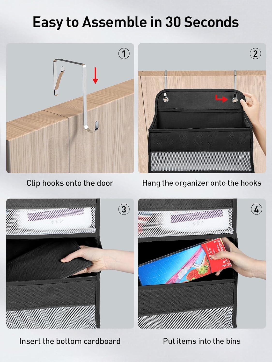 - Tool-free Assembly Within Seconds: No need to insert cardboard in the pockets as required by other bathroom storage shelves! We have it pre-inserted in the pockets to cut your hassle. Simply hang, put the cardboard in the bin's bottom, and done! Definitely a good pickup for anyone on a budget wanting to update organization and storage for extra storage