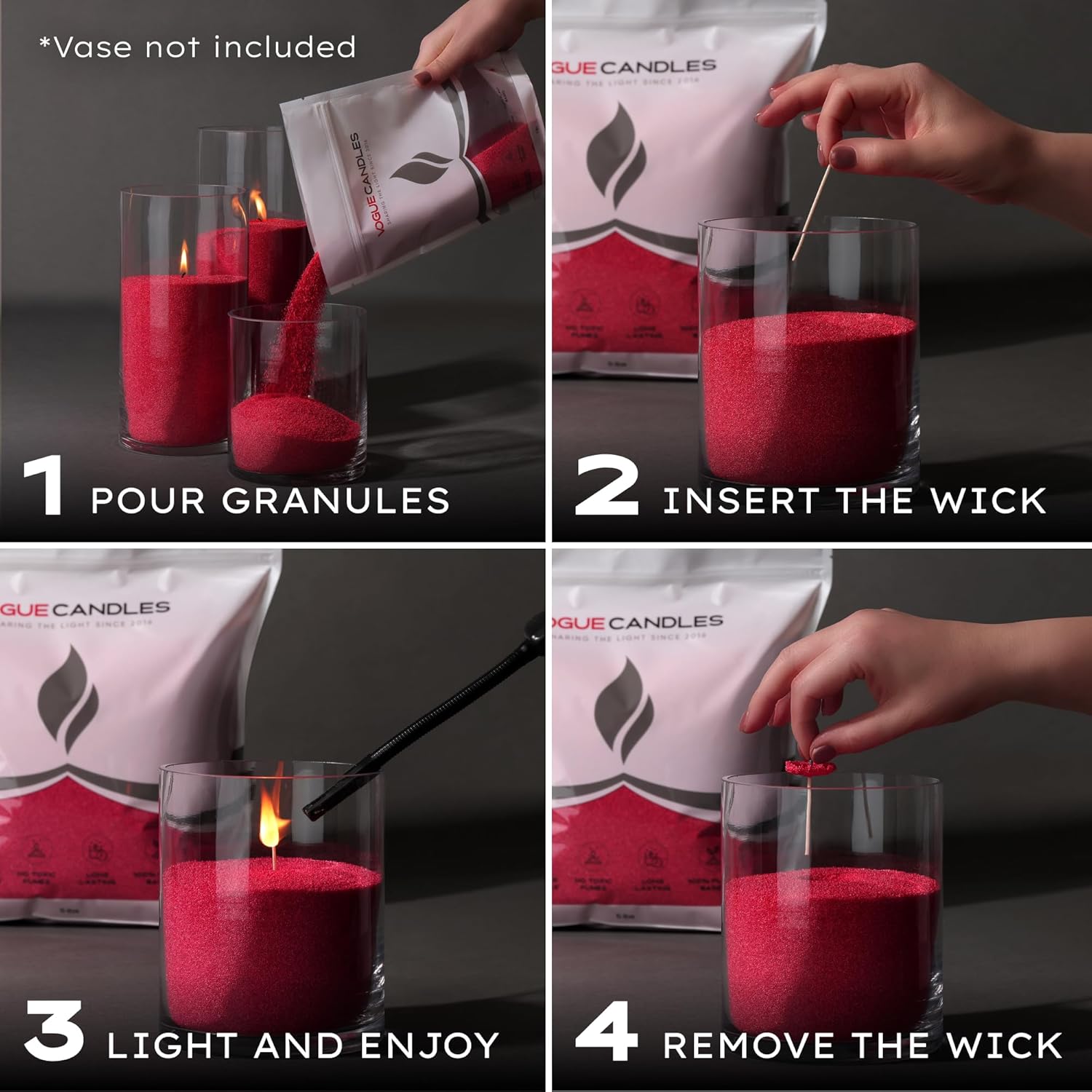 - Create a Candle, Your Way. No Mold, No Mess: Our signature plant based granules turn any vase or vessel into a stunning candle. Each 1LB kit includes 15 clean-burning cotton wicks. Each 5LB kit includes 50 wicks for extended use or gifting. Just pour to 2/3 full, insert a wick vertically, and light. No wax pouring or molds required. Every setup is unique, every candle is yours.