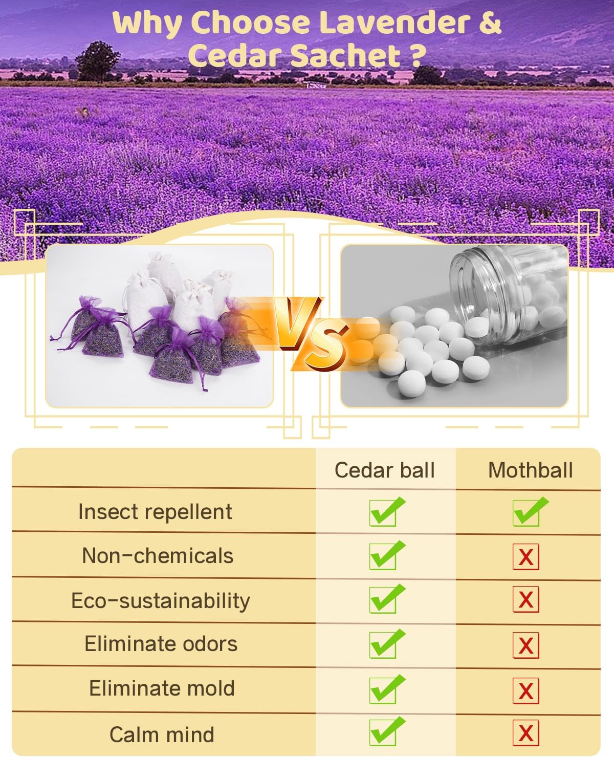 - Natural and Safe: Our sachet bags are made from 100% natural ingredients, providing a safe and eco-friendly option for your family. The combination of cedar blocks for clothes storage and lavender not only imparts a delightful scent but also protects your garments from moisture and pests