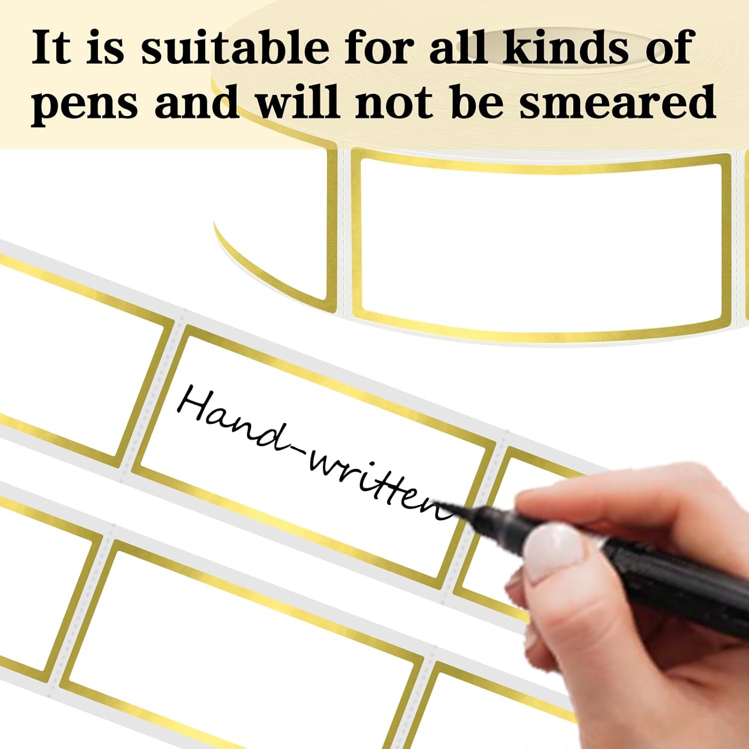 - Packaging: 600 pcs on a roll,Each measures 1” X 2”,Blank and white with gold border