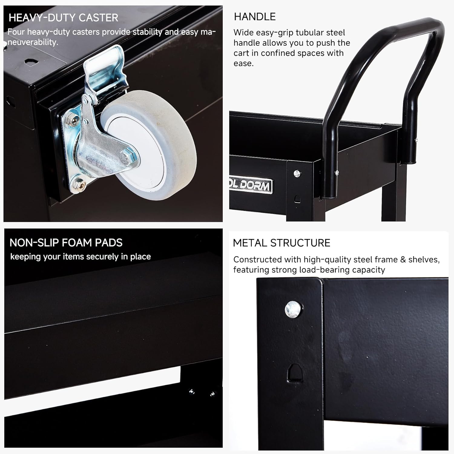 - Tool Dorm 3 Tray 29.3 inch Tool Cart, self assembly, 300 LBS Capacity Rolling Tool Carts on Wheels, Heavy Duty Utility Cart, Mechanic Tool Storage Cart for Garage, Warehouse and Repair Shop, Black