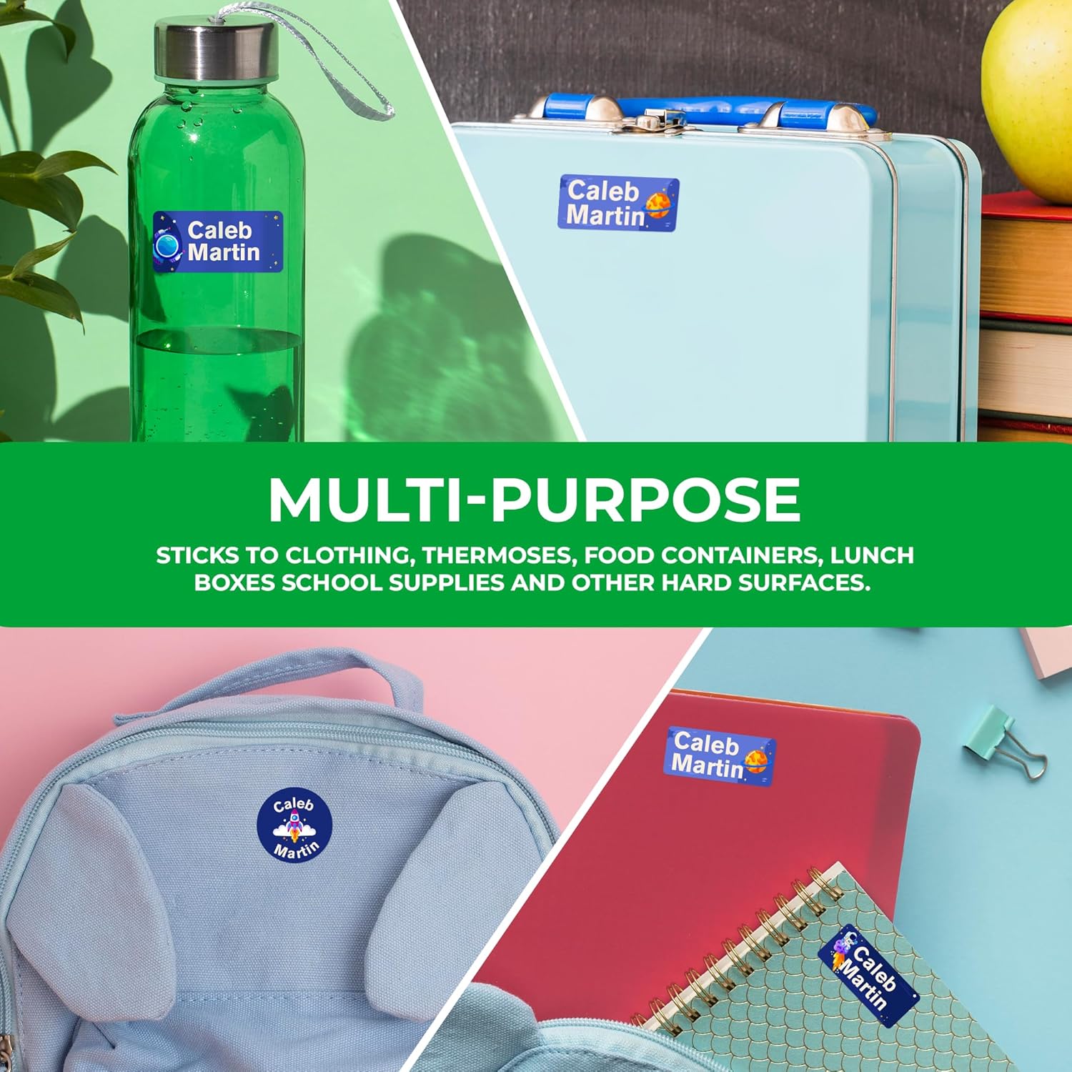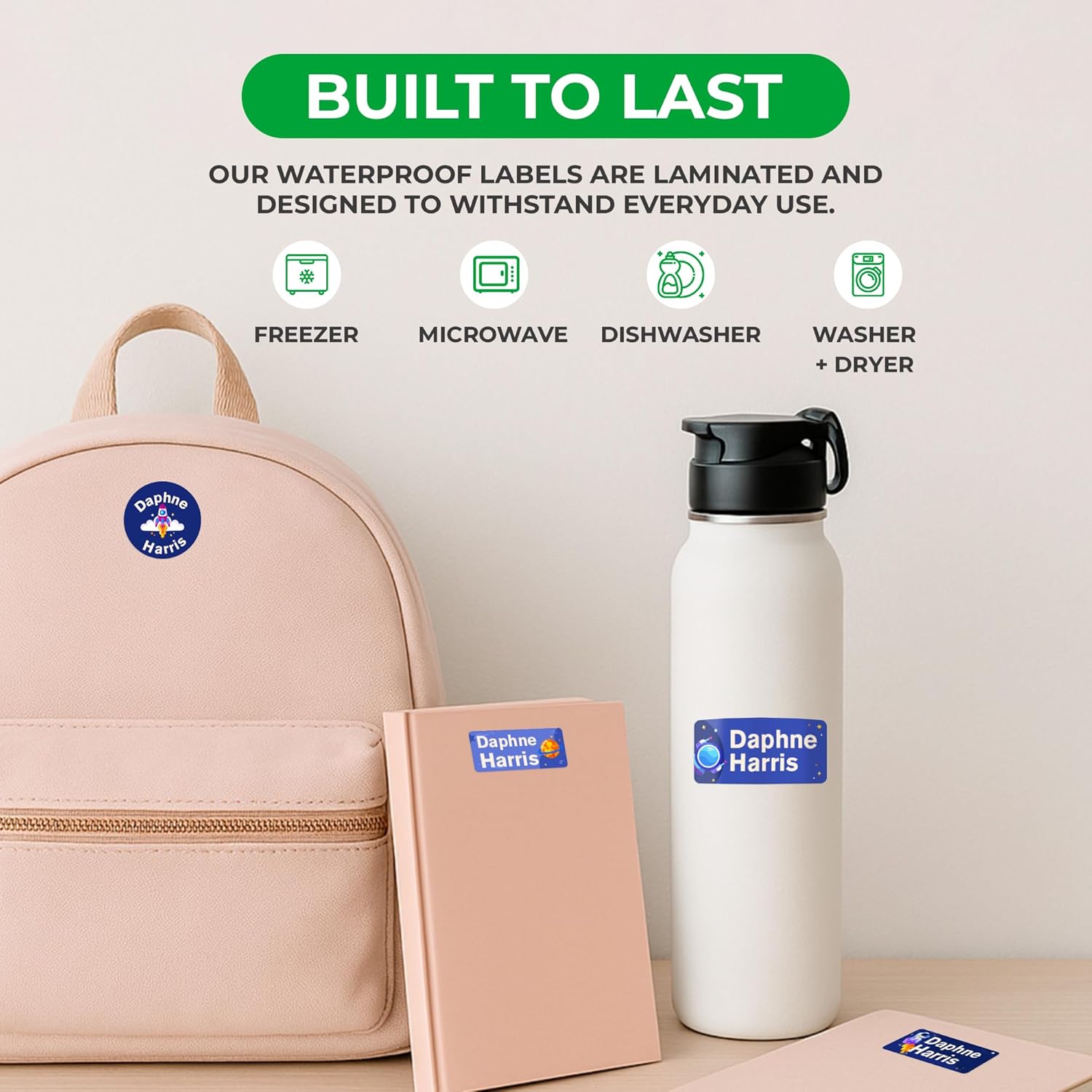 - 💧 Waterproof Stickers & Fade-Resistant — Laminated for long-lasting use, our custom stickers personalized won’t peel, fade, or rub off. Keep your kid’s name visible no matter where the day takes them. These waterproof vinyl labels stick to bottles, lunch boxes, clothing, notebooks, and more. Designed to survive dishwashers, microwaves, freezers, and even washer/dryers!